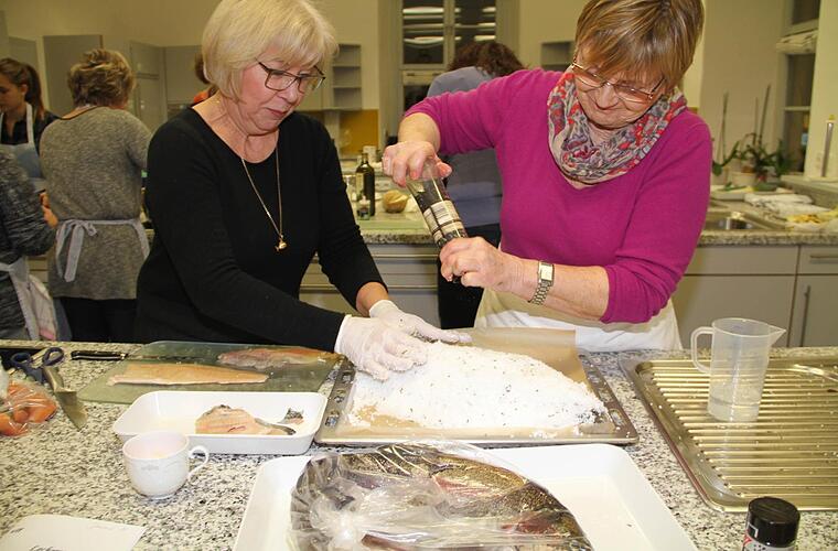 Ernährungsfachfrau Monika Gerner hatte dazu eine Reihe von Rezepten zusammengestellt, die von einer Suppe über Hauptgerichte bis hin zu kleinen Snacks und einem Brotaufstrich reichte. Nach einer kleinen Einführung über die Vorzüge von heimischem Fisch als hochwertiges Lebensmittel geht es an die Töpfe. Rund eine halbe Stunde muss ein Fisch in Salzmantel im Ofen garen. Ein Gericht, für das sich Ingrid Sünkel und Irmgard Schopf entschieden haben.