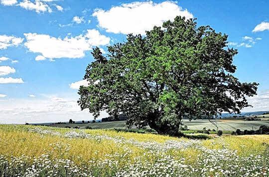 Die imposante Zeublitzer Eiche steht inmitten der weiten fränkischen Landschaft. Umrahmt wird sie von einer bunten Blumenwiese, über die Wolken am blauen Himmel dahinziehen. Eine Szenerie, die wie gemalt, wie künstlich erschaffen wirkt, die aber doch genau so gewesen ist - nämlich vor den Augen und der Fotokamera von Gregor Schmidt.