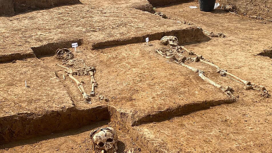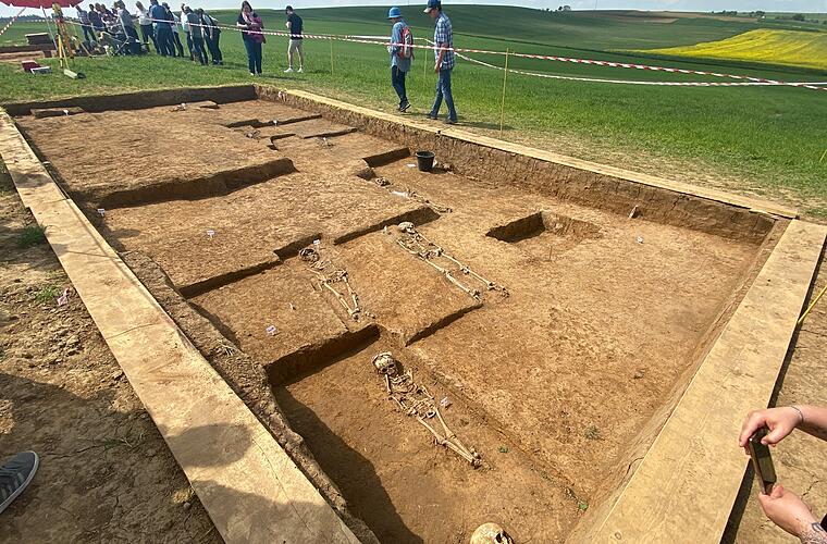 Der Zustand der Skelette sei wegen des kalkreichen Bodens sehr gut. "Das erste Grab lag nur wenige Zentimeter unter dem Pflughorizont, was die Notwendigkeit der aktuellen Grabung zeigt: Es wäre in den nächsten Jahren weggepflügtworden wie bereits andere vor ihm, wie aus den Funden von Knochensplittern auf dem Feld hervorgeht", schreibt die Arbeitsgemeinschaft. Sowohl Sargbestattungen als auch Deponierungen, bei denen die Toten wohl lediglich in ein Leichentuch eingewickelt waren, habe das Team feststellen können.