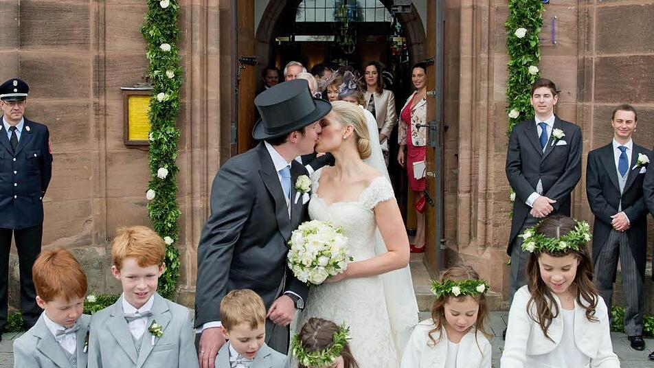 Anschließend lud die Adelsfamilie zur "eleganten Soirée" ins Faber-Castell'sche Schloss. Das Paar habe am Freitag im engsten Familienkreis standesamtlich geheiratet, teilte die Familie mit. Für die kirchliche Trauung trug die 30-jährige Braut eine klassische elfenbeinfarbene Robe aus Seidensatin und französischer Chantillyspitze der australischen Designerin Rhonda Hemmingway. Brautjungfern in bodenlangen dunkelblauen Roben halfen ihr mit der zwei Meter langen Schleppe, bevor sie an der Seite ihres Stiefvaters in die Kirche zog. Diese sei mit weißen Blumen und Seidenschleifen in den Familienfarben rot und gelb dekoriert, so die Mitteilung. Auch der Brautstrauß war aus weißen Blüten: Rosen, Pfingstrosen und Freesien.