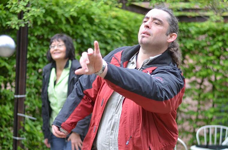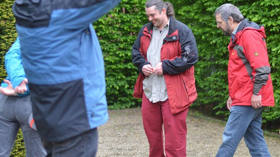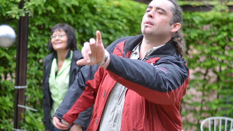 Das Wasser plätschert, die Vögel zwitschern. "Ein guter Wurf!", ruft Jérôme Rousselot in die Stille des Gartens hinein. "Die Hand muss vor der Kugel sein", erklärt der 37-jährige Mann von der Atlantikküste, der es rein äußerlich mit D´Artagnan locker aufnehmen könnte. "Wir nähern uns schon dem Schweinchen an", freut sich Rousselot, während sich Erika Grimm bereit macht für den nächsten Wurf.