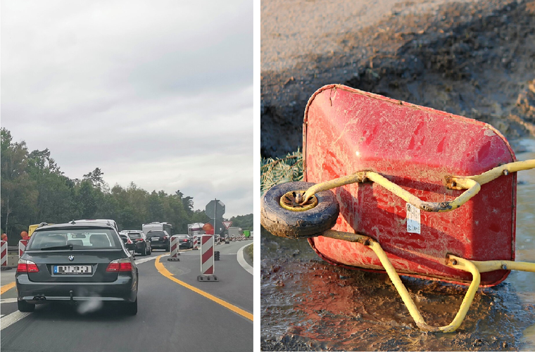 Der Polizei zufolge erkannten die nachfolgenden Fahrzeuge die Schubkarre zu spät und fuhren gegen sie beziehungsweise über die Trümmer, die sich im Anschluss auf der Fahrbahn befanden.