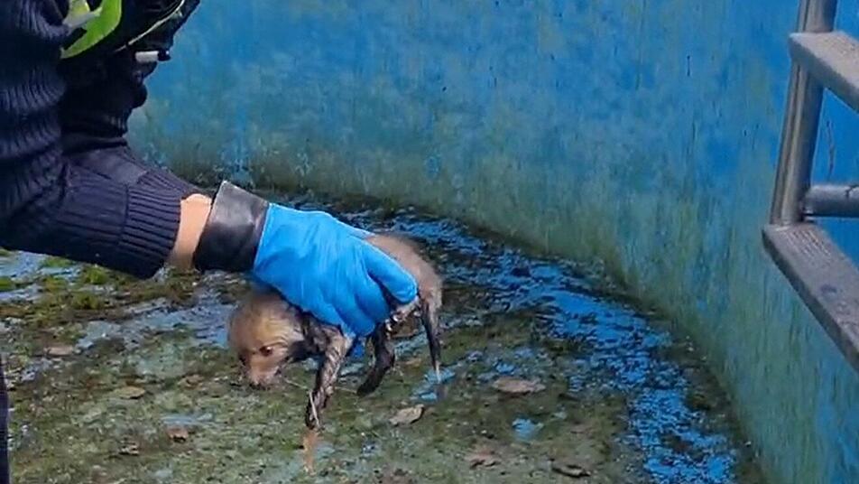 Laut der Polizei hatte eine Frau Schreie aus dem Becken gehört - schnell stellte sich heraus, dass ein kleiner Fuchs hineingefallen war. "Das Tier war erschöpft und kam nicht mehr allein heraus", beschreibt die Polizei die missliche Lage des Welpen.