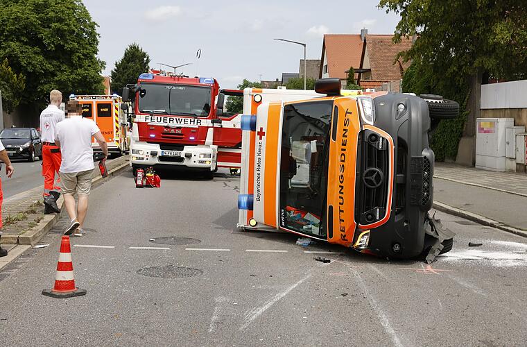 Ersthelfer brachten die Mitarbeiter des Rettungsdienstes ins Freie, sodass sich diese weiter um den Patienten kümmern konnten. Dieser wurde dann von der Feuerwehr in einen anderen Rettungswagen gebracht und nach Erlangen gefahren. Eine Notärztin untersuchte den 79-jährigen Fahrer des beteiligten Autos, er musste aber nicht weiter behandelt werden, so die Berufsfeuerwehr.