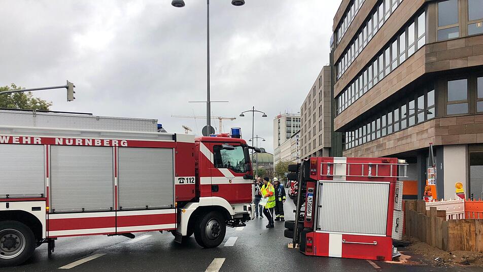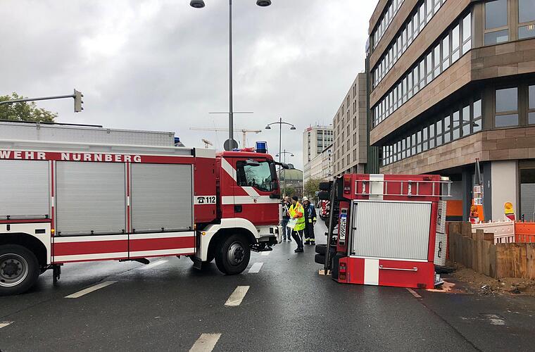 Auf dem Weg, anderen zu helfen, gerieten die Insassen eines Feuerwehrautos selbst in Not: In Nürnberg kollidierte das Einsatzfahrzeug mit einem anderen Verkehrsteilnehmer und kippte um.