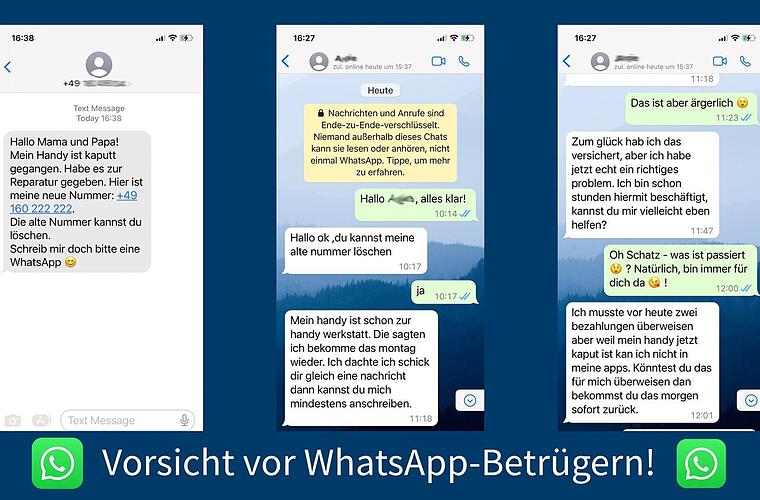 In dem von der Polizei geteilten Beispiel erhält die Mutter von ihrer vermeintlichen Tochter eine SMS-Nachricht, dass deren Handy kaputt sei - und sie es bereits "zur Reparatur gegeben" habe. Gleichzeitig wird die Mutter gebeten, eine WhatsApp an die neue Nummer zu schreiben - die Frau glaubt der Nachricht und leistet der Anweisung Folge.