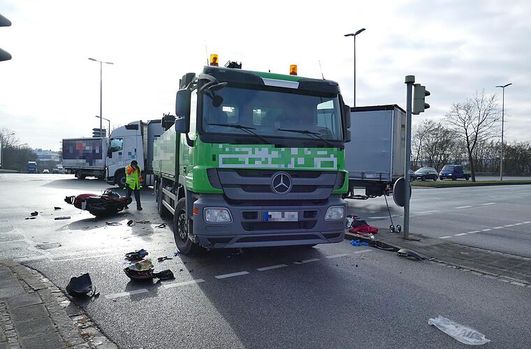 Nach einem Zusammenstoß am Montagvormittag zwischen einem Lkw und einem Rollerfahrer im Bereich des Nürnberger Hafens, schwebt der Fahrer des Motorrollers in Lebensgefahr.