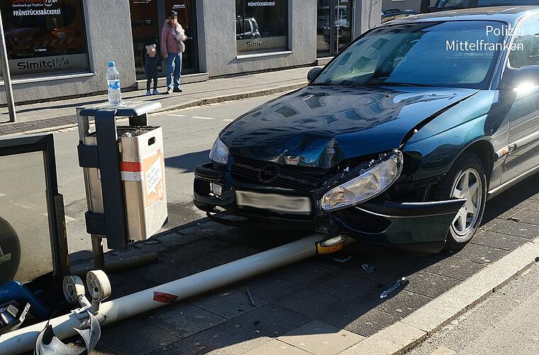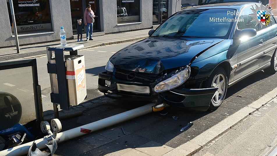Der Fahrer, ein 91-jähriger Mann, war kurz vor 18 Uhr auf der Bucher Straße stadtauswärts unterwegs. An der Kreuzung zur Juvenellstraße versuchte er im Bereich der dortigen Straßenbahnhaltestelle, nach links abzubiegen. Dabei erfasste er zunächst ein Verkehrszeichen und kollidierte anschließend mit einem Ampelmast bei der dortigen Straßenbahnhaltestelle. Durch die Kollision wurden beide Objekte aus ihrer Verankerung gerissen.