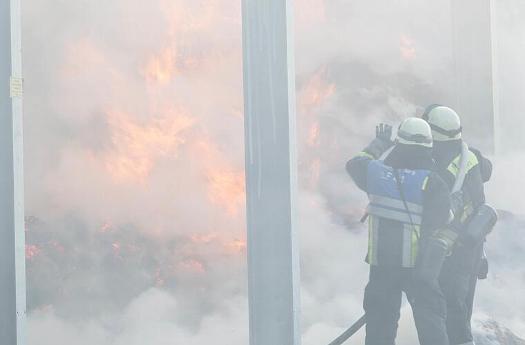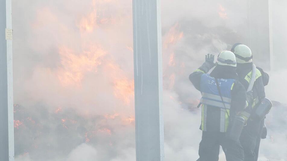 Strohballen in einer Halle in der Höllwiesenstraße in Flammen. Die Löscharbeiten durch die Nürnberger Berufsfeuerwehr und Freiwillige Feuerwehren aus den umliegenden Stadtteilen zogen sich bis in die Morgenstunden hin, da die brennenden Strohballen mithilfe eines Radladers des Technischen Hilfswerks Stück für Stück abgetragen und ins Freie transportiert werden mussten.