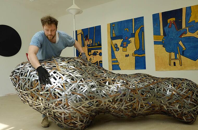 Kurz vor dem Startschuss ist an der Akademie der Teufel los. Überall wird am letzten i-Tüpfelchen gearbeitet. Auch Philipp Eyrich ist noch damit beschäftigt, seiner Skulptur aus Stahlbändern den letzten Schliff zu geben. "Ich nenne mein Kunstwerk ,Cytomali'", erzählt der 28-jährige Student aus der Klasse von Kunstprofessor Ottmar Hörl, der für seine bunten Dürerhäschen aus Plastik bekannt ist.