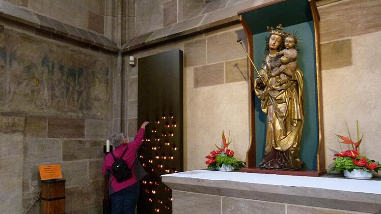 Tatsächlich eröffnet das Innere der Frauenkirche eine transzendente Welt. Tucheraltar, Baldachinfiguren, Strahlenkranzmadonna. Kaiserfenster: Es gibt so viele Blickfänge, Ankerplätze für die Andacht. Genau das streben die Menschen an, die wochentags darin eine Opferkerze entzünden oder still auf den Bänken Platz nehmen. Die fotografierenden Touristen staunen nur.