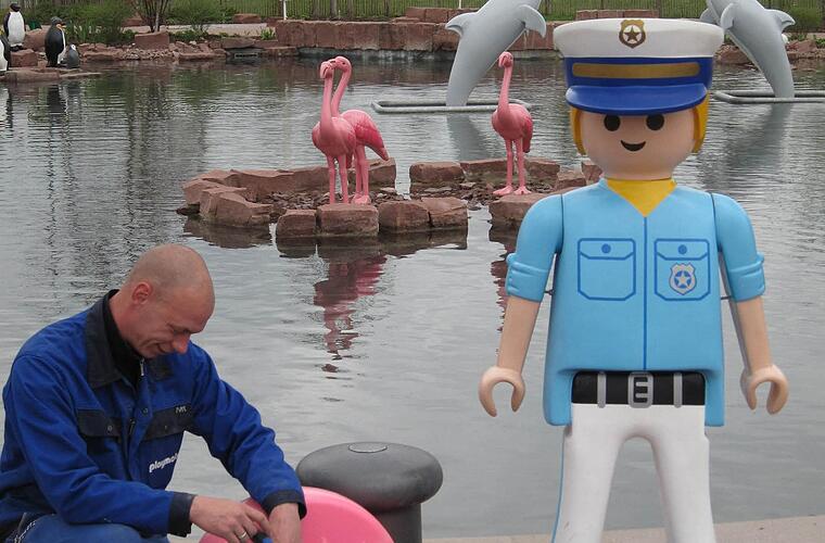 Im Park sind die Plastik-Männchen etwas größer als im Kinderzimmer. Die Mitarbeiter müssen ganz schön schuften, um den überlebensgroßen Spielfiguren einen neuen Anstrich zu verpassen. Selbst die Pferde auf dem Bauernhof haben neue Mähnen bekommen. "Die Pferde können jetzt wieder mit viel Liebe und Hingabe gebürstet, gestriegelt und geflochten werden", freut sich Lisa Stadi vom Playmobil-FunPark.