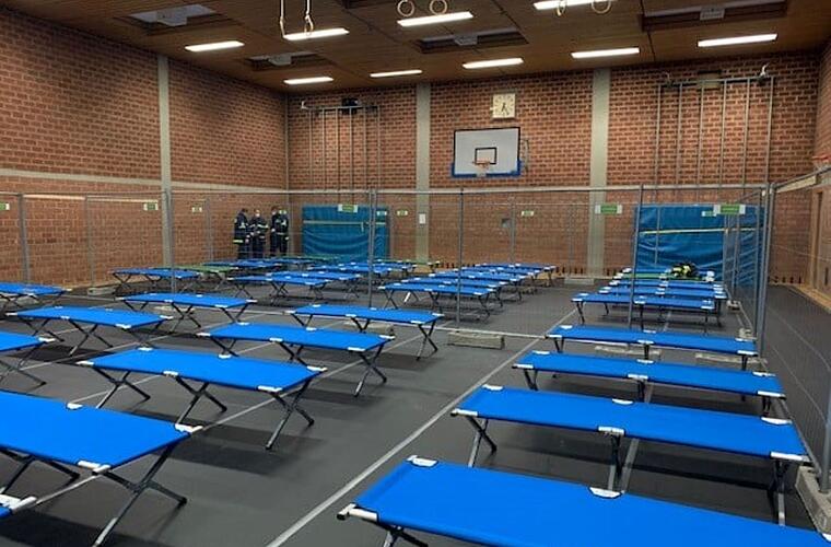 In einer Pressemitteilung verkündete die Gemeinde Leinburg am Freitag (18. März 2022) noch stolz die Fertigstellung der Unterkunft. "Dank hervorragender Zusammenarbeit aller Beteiligten haben wir hier ganz schnell eine Notunterkunft für Menschen aus der Ukraine herrichten können", äußert sich Bürgermeister Kraußer hier. "Nach den neuesten Brandschutzvorschriften", hätten das THW Lauf und die Feuerwehr Diepersdorf die Turnhalle umgebaut. Bierbänke der Brauerei Bub und Lebkuchen-Willkommenspakete der Firma Witte standen bereit.
