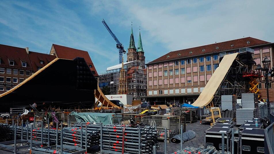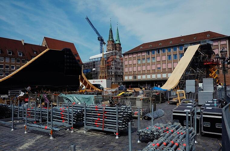 "Die Landung wird besonders kritisch", ist sich der 45-jährige Schreiner aus Nürnberg sicher, der im Auftrag der Berliner Fachfirma "Mellowpark" spektakuläre Sportparcours in aller Welt errichtet. "Dieser Bereich muss besonders stabil sein, wenn die Sportler mit ihren Rädern hier landen", erklärt Bößl und zeigt auf die Holzplatten, die auf ein Stahlgerüst gezimmert sind. Um die Konstruktion aus Stahlträgern und Eisenschrauben kümmern sich derweil Tobi und Benni von der Nürnberger Spezialfirma "Bassline". In dieser Woche haben die beiden Kollegen gemeinsam mit ihrer Mannschaft rund 90 Tonnen Stahl verschraubt. "Das ist fast schon Millimeterarbeit. Die Gerüste werden nach den Vorgaben der Statiker nach allen Regeln der Kunst errichtet", sagt Tobi und erklärt, dass sie sich bei der 14 Meter hohen Konstruktion auf dem Hauptmarkt nur eine Toleranz von einem halben Zentimeter haben erlauben dürfen.