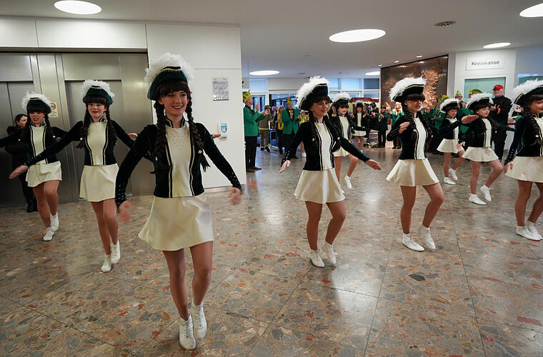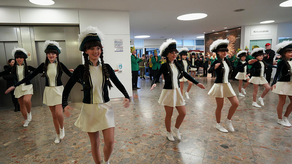 Landrat Armin Kroder wurde um 10.30 Uhr in seinem Büro von Mitgliedern der Faschingsgesellschaft abgeholt und unter musikalischer Begleitung ins Foyer geführt. Zwei Gardemädchen eskortierten ihn dorthin, wo bereits zahlreiche Schaulustige auf den Start des Programms warteten.