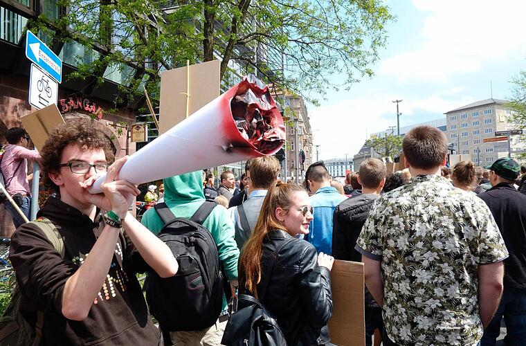 Nebenan hält Kalle ein Schild in den Himmel. "Gebt das Hanf frei!" hat der Nürnberger in bunten Lettern darauf gemalt. Ein paar Reihen davor nuckelt David an einer Riesentüte.