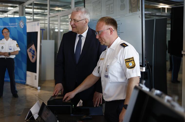 Bayerns Innenminister Joachim Herrmann und Roland Kerscher, Polizeipräsident des Polizeipräsidiums Niederbayern und Leiter der Projektgruppe Smart Borders Bayern, haben am Freitag (13. März 2026) am Flughafen Nürnberg ein neues EU-Ein- und Ausreisesystem (EES) bei der Bayerischen Polizei vorgestellt.
