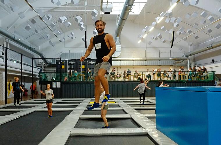 Den meisten Eltern auf der Zuschauertribüne dürfte schon vom Zusehen schwindelig werden. "Macht richtig Spaß. Aber ist auch richtig anstrengend", sagt Arsenis zwischen zwei Sprüngen und lässt sich mit einem breiten Grinsen wieder hoch hinauf in Richtung Hallendach katapultieren. Hüpfen kann offensichtlich glücklich machen.