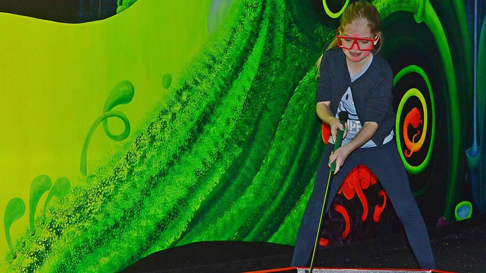 "Für die erste Bahn habe ich nur drei Schläge gebraucht", erzählt die neunjährige Leyla stolz. Jetzt sind die Geschwister aus der Patchwork-Familie an der Reihe. Auch Levy und Enya haben sich das Gesicht vor Spielbeginn mit Leuchtfarben bemalt. In der dunklen "Schwarzlichtfabrik" schauen die bunten Streifen auf ihren Wangen wie eine Kriegsbemalung der Techno-Indianer aus. "Das macht total Spaß. Und es ist mal was anderes als Kino", findet Johannes, der Familien-Häuptling.