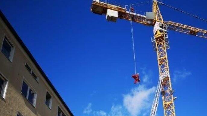 Kranführer wird auf dem Schwenkarm in Trage umgebettet