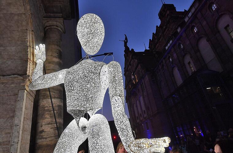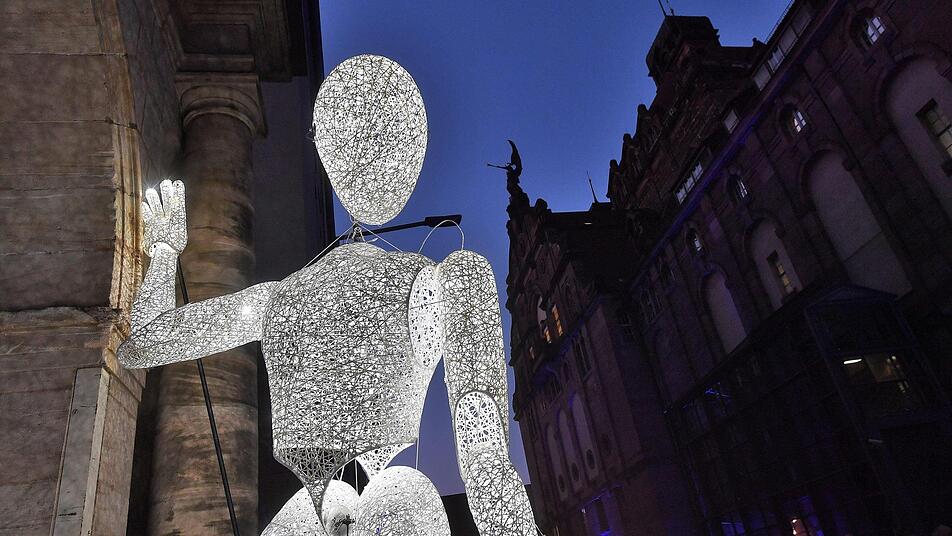 Derweil haben die 120 Pferdestärken den Vestnertorgraben im Rücken der Kaiserburg erreicht. Andrea winkt kurz dem Fahrer zu und hüpft dann die drei Stufen beim Ausstieg hinunter. Viele andere Fahrgästen wählen den selben Weg. Denn von der Haltestelle ist es nur ein Katzensprung zur "Burgprojektion" und damit zum Höhepunkt jeder "Blauen Nacht". Heuer hat Dan Reeder, Nürnberger Künstler-Urgstein mit amerikanischen Wurzeln, die Ehre. Im Internet kursieren bereits Fotos von Riesenbratwürsten, die wie zum Anbeißen über die Kaiserburg tanzen.