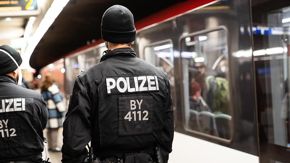 Polizeibeamte stehen in einer Nürnberger U-Bahn Station. Einsatzkräfte der Polizei führten zusammen mit Kontrolleuren der VAG Kontrollen im Nürnberger ÖPNV durch - besonders ob die 3G-Pflicht ...