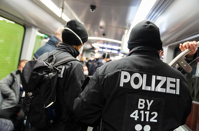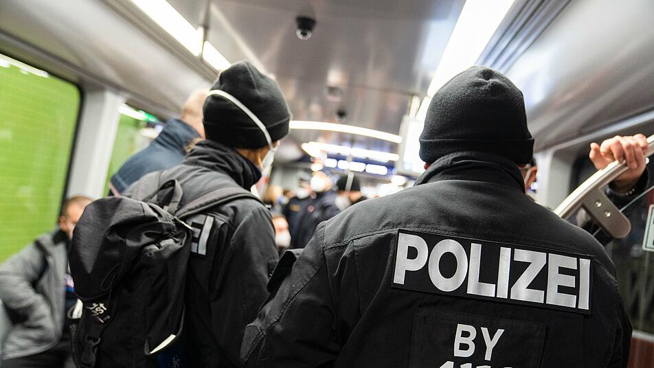 01.12.2021, Bayern, Nürnberg: Polizeibeamte kontrollieren in einer Nürnberger U-Bahn die 3G-Maßnahme. Einsatzkräfte der Polizei führten zusammen mit Kontrolleuren der VAG Kontrollen im Nürnberger ...