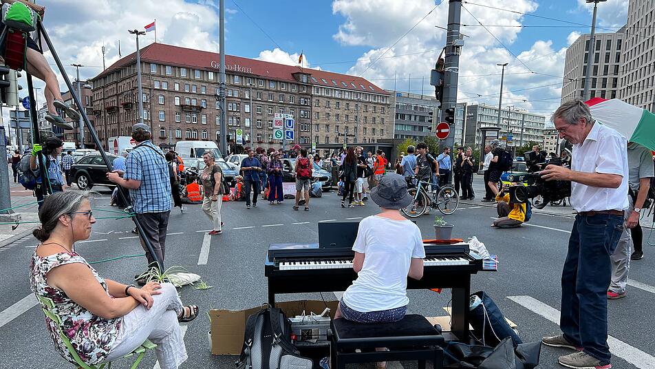 Laut einer aktuellen Mitteilung des Polizeipräsidiums Mittelfranken klebten sich 16 Personen auf der Fahrbahn fest. Mehrere Aktivisten befestigten sich zudem an Ampel- und Oberleitungsmasten. Wie in der Bildergalerie zu sehen ist, befanden sich außerdem mehrere Bierbänke und ein Klavier inklusive Musiker auf der Fahrbahn.