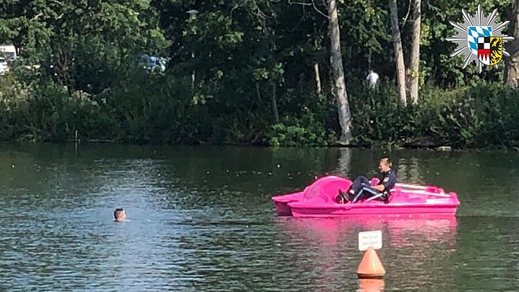 Mit einem rosafarbenen Tretboot fuhr ein Beamter auf dem Wöhrder See zu dem Badegast. Er warnte den angetrunkenen Schwimmer vor dem Badegang. In dem Bereich, in dem er schwamm, besteht erhöhte Gefahr. Grund dafür ist ein Wasserkraftwerk. Dessen Turbinen werden durch das Wasser des Wöhrder Sees angetrieben.