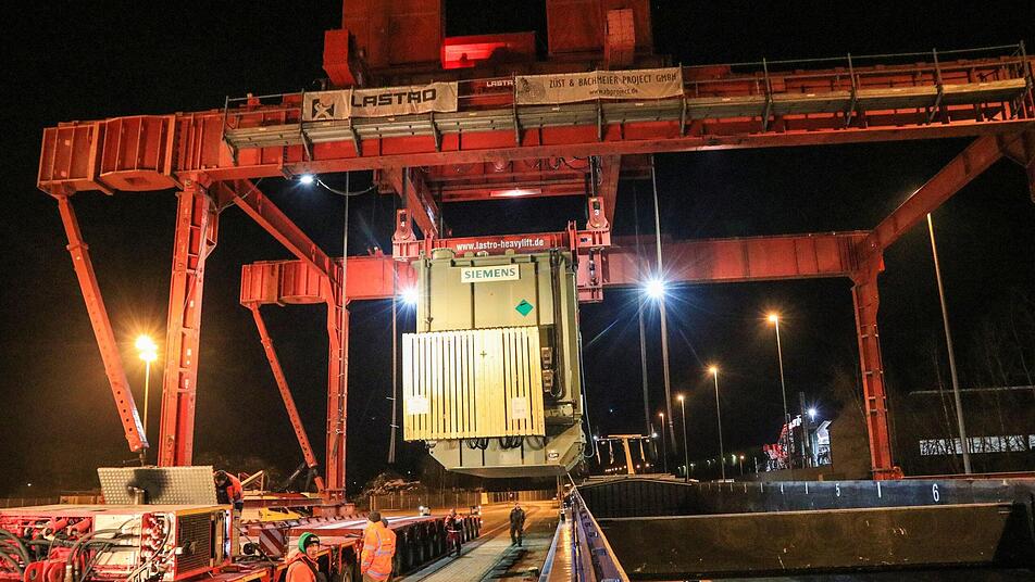Am späten Montagabend hat sich ein Schwertransport seinen Weg durch Nürnberg gebahnt. Mit zwei Zugmaschinen, teilweise unterstützt von einer dritten, ging es vom Siemens-Werksgelände zum Schwerlast-Kai am Nürnberger Hafen.