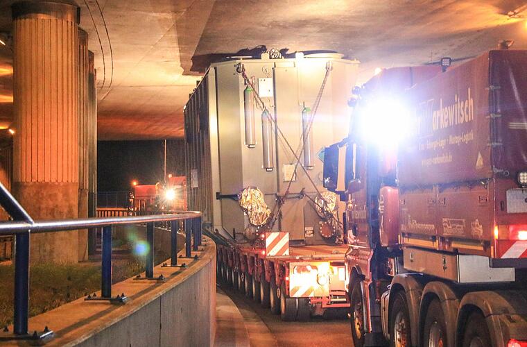 Ein Schwertransport rollte am späten Montagabend (20.01.2020) durch Nürnberg. Geladen hatte er einen 430-Tonnen-Trafo, das Gesamtgewicht des Transports lag bei rund 585 Tonnen.