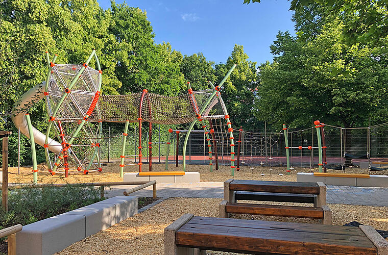 Auf der Grundlage verschiedener Beteiligungsformate ist eine planerische Neugestaltung der Anlage erfolgt. Vorhandene, nicht mehr zeitgemäße Spielgeräte wurden entfernt und durch neue ersetzt. Die Spielfläche wurde erweitert, vollständig mit Holzhäckseln als Fallschutz bedeckt und mit barrierefreien Rampensteinen eingefasst. Die neue Spielkombination ist mit diversen Kletter- und Balancierkomponenten für Kinder und Jugendliche unterschiedlicher Altersklassen geeignet. Zusätzlich laden verschiedene Calisthenics-Elemente zu Fitness- und Eigengewichtsübungen ein.