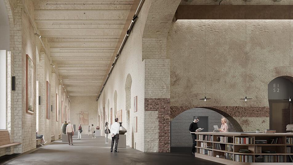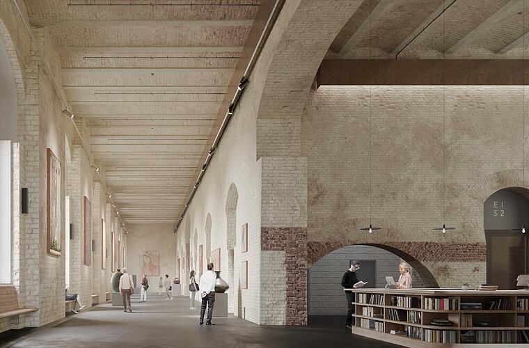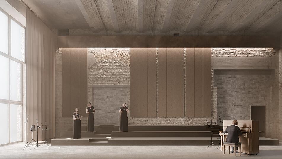 Der Entwurf für den Bestand übernimmt dezent Elemente - beispielsweise Beleuchtungskörper, runde Messingelemente beziehungsweise Reflektoren - aus dem Neubau und verbindet so auf subtile Weise Alt und Neu ohne jede Anbiederung und ohne den Gebäudeteilen ihre spezifische Eigenständigkeit zu nehmen. Es gelingt, den Bestand in seiner rohen, historischen Anmutung zu erhalten. Neu hinzu kommen sicher begehbare, barrierefreie Böden. Wände und Decken werden gereinigt, aber nicht verputzt oder neu gestrichen. Installationen erfolgen sichtbar, aber geordnet. Raumakustisch erforderliche Elemente sind gestalterisch zurückhaltend integriert und auf das Nötige beschränkt.
