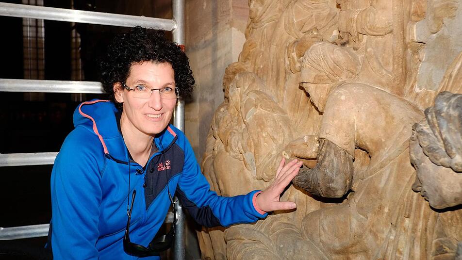 Katrin Müller steht in der dunklen Karthäuserkirche im Germanischen Nationalmuseum in Nürnberg und zeigt auf eine mannsgroße Steintafel, die alles andere als gesund aussieht. Mit dicken Verbänden ist die Christusfigur wie eine Mumie umhüllt. "Das war ein besonders komplizierter Patient", erklärt die Restauratorin und steigt mit einem Skalpell in der Hand auf die Leiter.