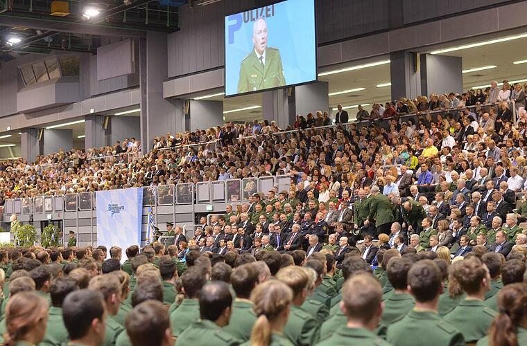 Unter der Mütze funkeln die Augen. "Ich wollte schon immer zur Polizei. Seit meiner Kindheit träume ich davon, Kommissarin zu werden", sagt die 19-jährige Marion Liebhardt und rückt die Schirmmütze zurecht. 294 Frauen und 950 Männer, die ihren Dienst an sieben Ausbildungsstandorten bei der Bereitschaftspolizei angetreten haben, sind am Samstag auf das Grundgesetz und die Bayerische Verfassung vereidigt worden. "Das ist heute für mich wirklich ein sehr bedeutender Tag", sagt Marion Liebhardt. Dann spielt das Polizei-Orchester einen zünftigen Marsch und gemeinsam mit über 1200 anderen jungen Menschen in Uniform zieht die 19-Jährige feierlich in die Frankenhalle ein.