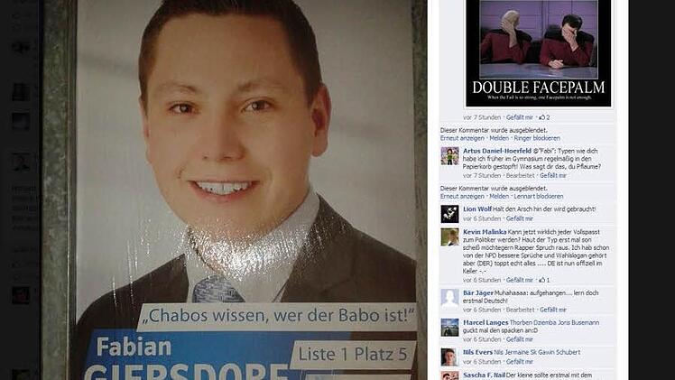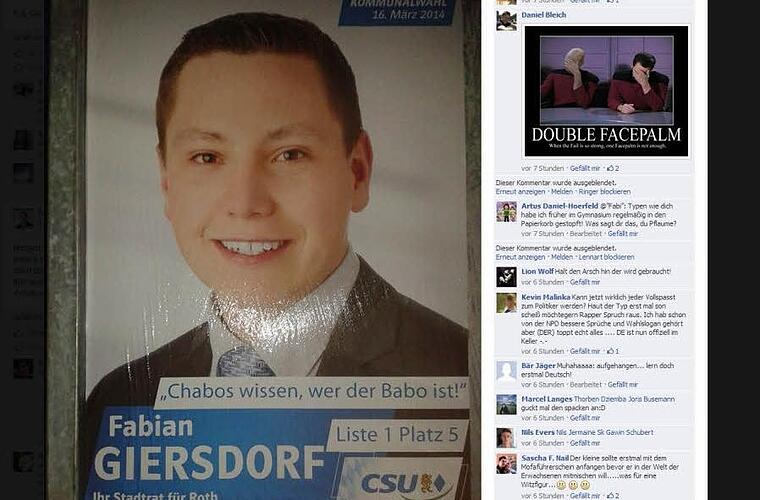 Mit einem Liedtext des Rappers "Haftbefehl" wirbt der 23 Jahre alte CSU-Kommunalpolitiker Fabian Giersdorf auf seinen Wahlplakaten - und hat damit den Spott vieler Facebook-Nutzer auf sich gezogen. Der Rapper droht mit rechtlichen Schritten.