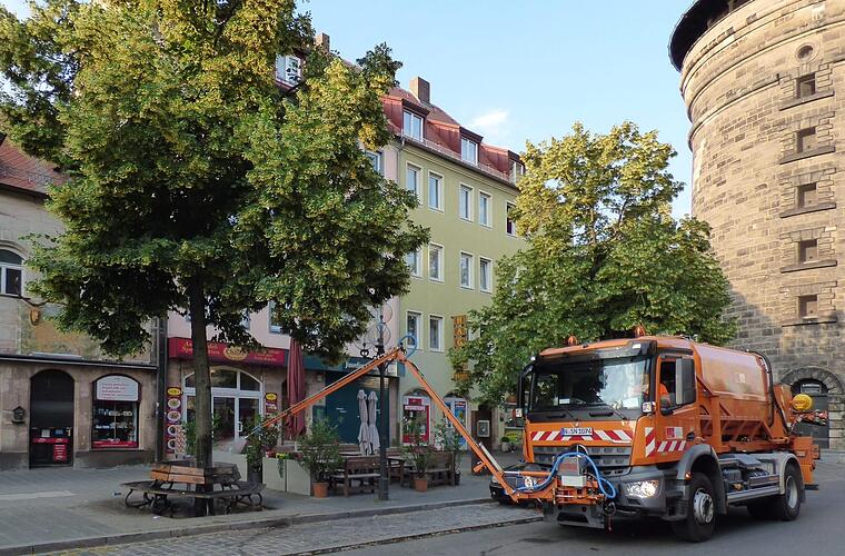 Überhaupt scheint die Stadt derzeit alles tun zu wollen, damit die Bäume in der City den Kampf gegen die Heißzeit überstehen. "Es werden momentan drei Wasserfahrzeuge eingesetzt, die den Baumbestand in der Altstadt, dem Altstadtring und dem Mittleren Ring einmal in der Woche gießen", sagt André Winkel vom Servicebetrieb Öffentlicher Raum (SÖR), der sich in Nürnberg um die Pflege der Grünanlagen kümmert. Pro Tag würden in Nürnberg derzeit rund 45.000 Liter gegossen. Die Kosten für das Gießen der Bäume belaufen sich laut Stadt allein auf rund 280.000 Euro. Vor dem Hintergrund der Hitzewelle hat die grüne Stadträtin Andrea Catrin Bielmeier kürzlich mehr Gießfahrzeuge gefordert und vor einem Baumsterben durch die Trockenheit gewarnt.