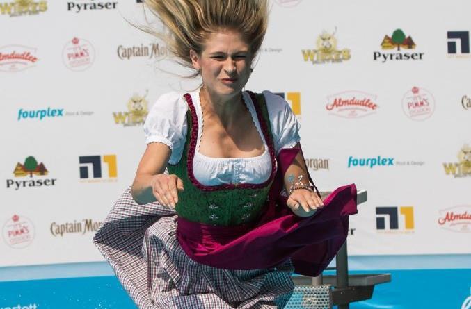 Das Testspringen zur Dirndl-Flug-WM 2017 in Nürnberg war schon mal feucht-fröhlich. Wer mitmachen will Ende Juli, kann sich noch anmelden.