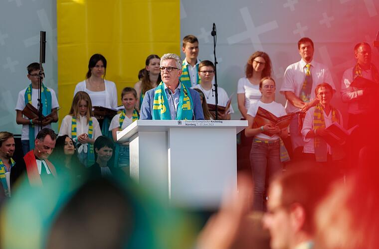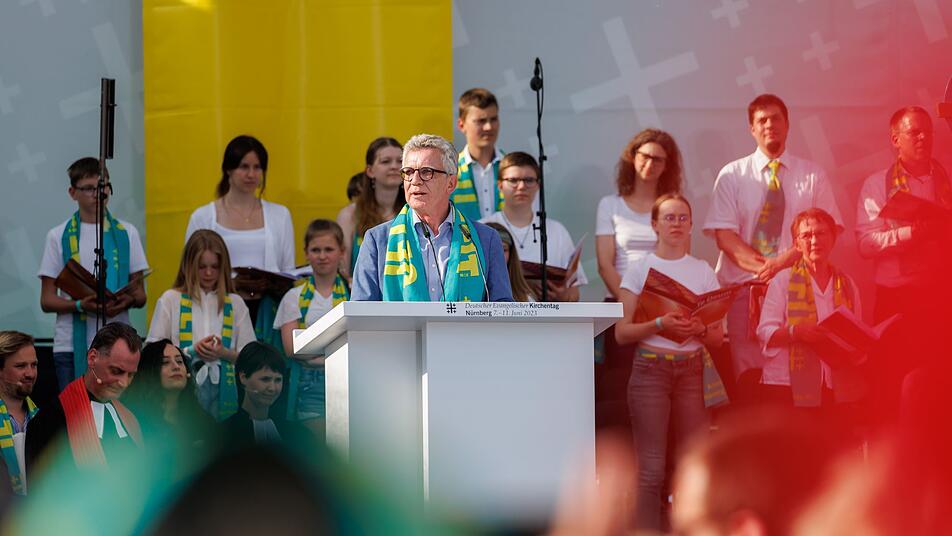 Der 38. Deutsche Evangelische Kirchentag dauert noch bis Sonntag. De Maizière sagte, die evangelische Kirche öffne sich mehr als bisher. "Wir wollen mehr sein als ein evangelisches Milieutreffen. Hier trifft sich die Mitte der Gesellschaft. Hier sind die Themen, die alle betreffen, da." De Maizière nannte dabei die Spannungsfelder Krieg und Frieden oder Klima und Schöpfung. Hier quälten sich auch Christen und die Gesellschaft über den richtigen Weg. "Die Themen sind ernst, aber die Menschen sind dabei heiter", sagte der Kirchentagspräsident über das Treffen in Nürnberg.