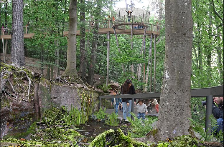 Ein Kernpunkt dieses Konzepts ist die Idee, Besucher und Schülergruppen gezielt in die Kronenregion der heimischen Bäume zu führen. Bei dem bis zu 20 Meter hohen Waldpfad treffen die Zoogäste Waldvögel auf Kopfhöhe und Leoparden in der Baumkrone, spielen in schwindelerregender Höhe zwischen Himmel und Erde oder knien am Boden, um einen Feuersalamander zu beobachten.