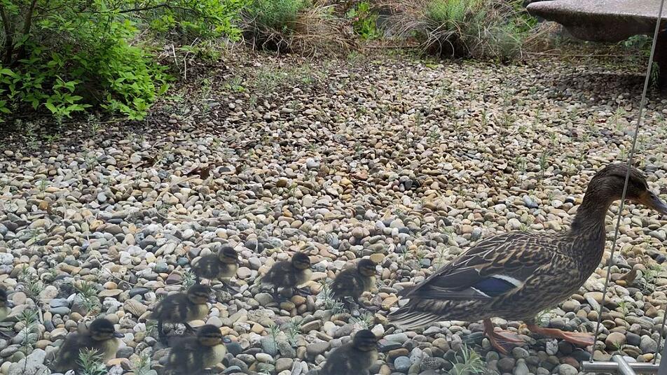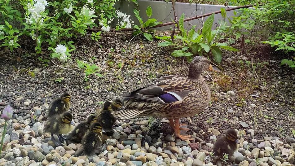 "Das hatte der Hausmeister nicht erwartet, als er morgens in der Grünanlage nach dem Rechten sah", heißt es in der Mitteilung. Eine Entenmutter watschelte mit acht Küken über den Kies. "Eigentlich ein hübsches Versteck, das sich die Stockente da zum Brüten ausgesucht hatte." Der Innenhof neben der Notaufnahme in Haus 20 auf dem Campus Nord ist mit Stauden bepflanzt und ungestört. "Ungünstig bloß, dass man von dort nur fliegend wieder wegkommt. Das können Vogeljunge noch nicht", erläutert das Klinikum. Die Ente suchte mit ihren frisch geschlüpften Küken nach einem Ausgang aus dem umbauten Hof.