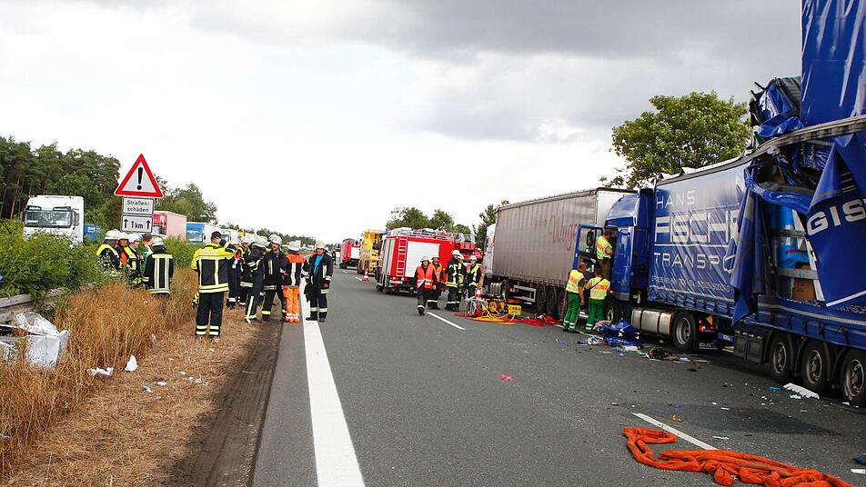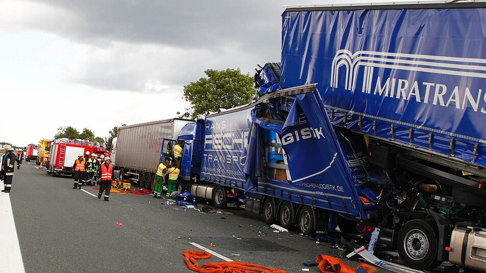 Am Nachmittag kam es aufgrund einer Baustelle zwischen den Anschlussstellen Neuendettelsau und Schwabach zum Stau. Kurz vor 13.45 Uhr fuhr ein Fahrer mit seinem tschechischen Lkw auf einen bereits am Stauende stehenden Lkw auf. Dies teilte die Polizei mit. Durch die Wucht des Aufpralls wurde dieser Sattelzug dann auf einen weiteren geschoben, der so wiederum auf den vor ihm stehenden Sattelzug prallte. Die vier beteiligten Lkw wurden teilweise übereinander geschoben. Der 46-jährige polnische Staatsbürger wurde in seinem Führerhaus eingeklemmt und konnte erst gegen 18.30 Uhr tot geborgen werden. Der 60-jährige tschechische Staatsbürger war ebenfalls eingeklemmt und wurde aufgrund seiner schwerer Verletzungen mit einem Hubschrauber in ein Nürnberger Klinikum geflogen. Der dritte beteiligte Lkw-Fahrer kam mit leichteren Verletzungen davon, der vierte blieb unverletzt.