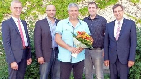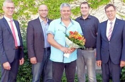 Der Oberweider Tino Helmbold (Foto, Mitte) ist seit mittlerweile 25 Jahren beim Energiedienstleister Überlandwerk Rhön GmbH in Mellrichstadt beschäftigt. Er begann am 1. Juli 1992 im Unternehmen und war zunächst bei der Baukolonne sowie der Bezirksstelle Feldatal tätig. Mittlerweile ist Helmbold bei der Bezirksstelle Ulstertal eingesetzt und nimmt dort seit Februar 2006 am Bereitschaftsdienst für das hessische Gebiet teil. In einer kleinen Feierstunde dankten Geschäftsführer Helmut Grosser (rechts), der Kaufmännische Leiter, Joachim Schärtl (links) und Betriebsratsvorsitzender Wolfgang Stumpf (Zweiter, von rechts) sowie Ingo Habig, Bezirksstellenleiter Ulstertal (Zweiter, von links) für die Treue zum Unternehmen und die geleistete Arbeit. Foto: B.Geiß