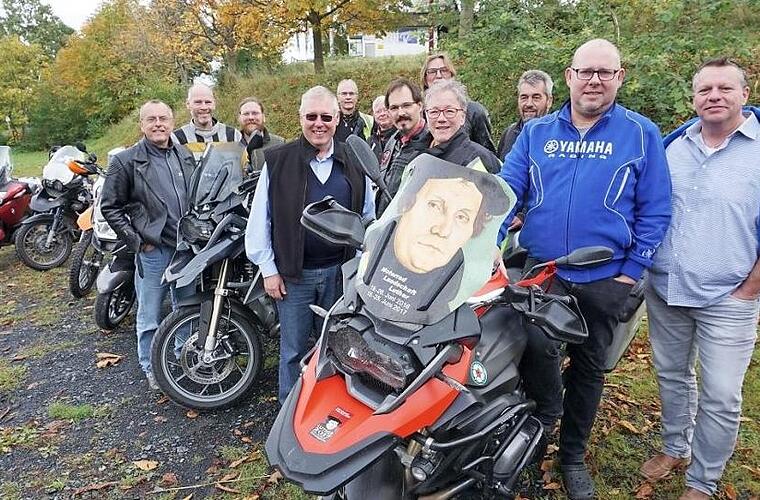 Luther auf der Motorradscheibe, das ist schon ein Hingucker. Der Reformator fährt beim evangelischen Pfarrer Frank Möwes immer mit und musste schon öfter für ein Fotomotiv herhalten. Pfarrer Frank Möwes ist Sprecher der Arbeitsgemeinschaft "Motorrad Evangelisch", die ihre Arbeitstagung in der christlichen Tagungsstätte "Hohe Rhön" abhielt. Austausch, Impulse zur Motorrad-Seelsorge und natürlich das gemeinsame Motorradfahren gehörten zu den Inhalten. An der Arbeitstagung nahmen evangelische Pfarrer und Diakone sowie Ehrenamtlichen teil, die zu "Motorrad-Evangelisch" gehören so Mitglieder des Vereins "Bikers Helpline" einer 24 Stunden Telefonseelsorge für Motorradfahrer. Insgesamt waren es 14 Teilnehmer.