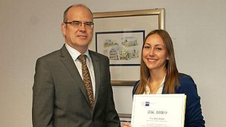 Das Team der Filiale in Bad Neustadt ist in Sachen Qualifikation gut aufgestellt: Lisa Witzel absolvierte ihre Ausbildung in der Bank Schilling in Schweinfurt. Sie wechselte im Anschluss an ihre Ausbildungszeit in die Sachbearbeitung der Kreditabteilung in Hammelburg und bildete sich in ihrer Freizeit zur Wirtschaftsfachwirtin weiter. Im Januar 2017 trat Witzel als Anlageberaterin in die Filiale Bad Neustadt ein. Harald Maisch (links), Filialdirektor der Filiale Bad Neustadt gratulierte Lisa Witzel (rechts) herzlich zur bestandenen Abschlussprüfung der Geprüften Wirtschaftsfachwirtin. Foto: PR