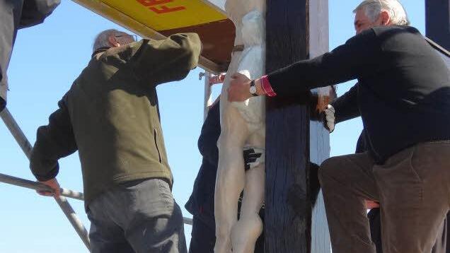 Anderthalb Stunden hatte es gedauert. Aber eigentlich war es "nur" das Anbringen der drei restaurierten Figuren an den Kreuzen.