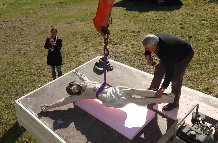 Ohne Kran wäre es nicht möglich gewesen die Figuren nach oben zu bringen, sind sich alle Akteure sicher. Es war schwierig die schweren Figuren so über das Gerüst zu transportieren und in luftiger Höhe an die Kreuze zu bringe. Vor allem die schwere Christusfigur war nur von mehreren Männern gleichzeitig zu halten und zu sichern.