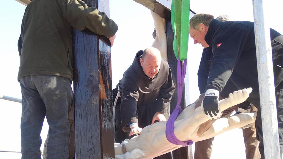 Selbst so nahe mit dabei zu sein, das ist nicht ohne." So hatte das Anbringen der Christusfigur und der beiden Schächer zwei Aspekte. Den des Glaubens und den des handwerklich Praktischen. Mit einem Kran wurden die Figuren vom Pritschenwagen der Firma Fries