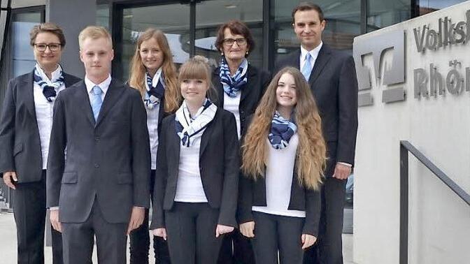 Während der umfassenden praktischen Ausbildung in den Filialen und Bankbereichen der Volksbank Raiffeisenbank Rhön-Grabfeld lernen die Auszubildenden einen sehr vielfältigen und anspruchsvollen Beruf kennen. Neben dem alltäglichen Bankbetrieb bekommen die Auszubildenden durch innerbetriebliche Schu-lungen sowie den Unterricht an der Berufsschule Bad Kissingen die theoretischen Kenntnisse und Fertigkeiten der Bankkaufleute vermittelt. Zu-sätzlich werden sie durch Seminare an den ge-nossenschaftlichen Akademien auf eine erfolg-reiche Abschlussprüfung und auf das spätere Berufsleben vorbereitet Auf Foto (von links): Nicole Förster (Personalleiterin), Moritz Sternberger, Maya Möltner, Julia Zöller, Sibylle Schwarz (Ausbil-dungsleiterin), Kristin Schreiber und Vorstandsmitglied Michael Reif. Foto: PR
