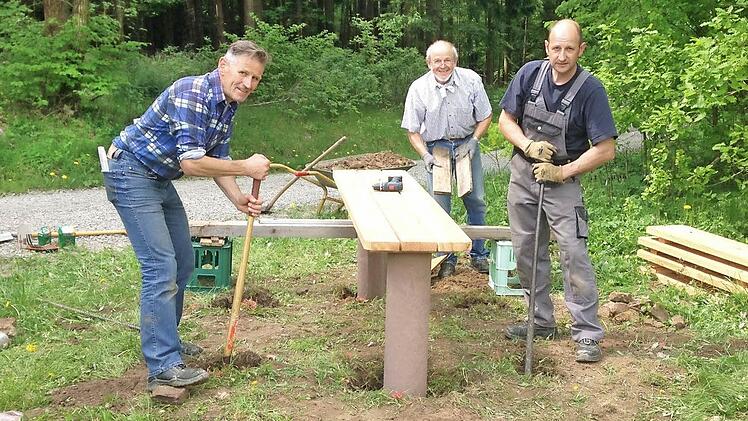 Die fleißigen Helfer des Rhönklub Zweigverein Walddörfer haben in der Nähe von Kilianshof auf der Hochrhöner Extra-Tour, dem K-Weg, eine Ruhebank aufgestellt. Lange, fast zwei Jahre, haben sie auf die Lieferung der Bank gewartet, doch nach dem Motto "Was lange währt wird endlich gut" steht die Bank nun. Mit einer schönen Aussicht auf den Kiliansküppel und den Beilstein sowie auf das Örtchen Kilianshof werden die Wanderer bei ihrer Rast belohnt. Unterstützung erfuhren Vorsitzender Claus Kleinhenz, Wegewart Pius Bühner und der stellvertretende Wanderwart Bernhard Holzheimer durch Franz Söder aus Kilianshof und seiner Bohrvorrichtung. Dennoch mussten sie einige Stunden mit Handgrabungen verbringen. "Man muss wissen, hier in den Walddörfern sind wir Steinreich", scherzte Kleinhenz. "Nach 15 Arbeitsstunden wurden unsere Mühen mit einer kräftigen Brotzeit und einen guten Schluck Rhöner Bier belohnt." Die fleißigen Arbeiter waren (von links) Claus Kleinhenz, Pius Bühner und Bernhard Holzheimer. Foto: Marion Eckert